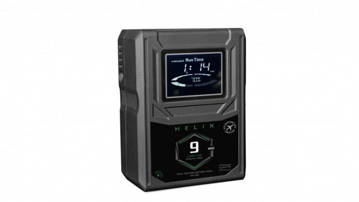 The V-mount Helix 9 Mini 98Wh Dual-Voltage Battery from Core SWX is a professional battery designed for modern production workflows involving a wide range of equipment. The compact design means the battery takes up less space than previous-generation models to better fit gimbal stabilizers and other rigs where space is at a premium. Though the design is less space-consuming, the Helix 9 Mini provides the same 98Wh capacity as its predecessors. To support various equipment types from small accessories to larger cinema cameras and lights, the Helix 9 Mini supports a 12.8A, 14.8V continuous draw, and it also provides simultaneous dual-voltage output with a maximum load of 6A at 28V and a maximum load of 12A at 14V.