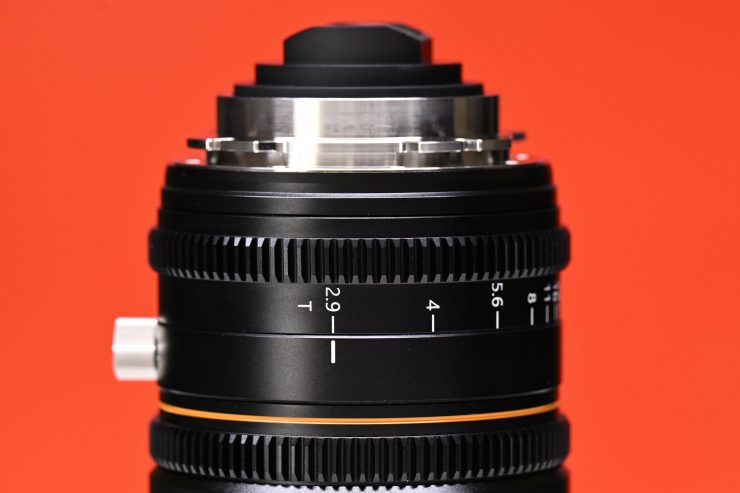 The lens is designed with an 82mm front filter thread for attaching filters or diopters. The front diameter is a standard 95mm for matte box mounting. This is the same as the 35mm and 50mm 1.8x T2.9.