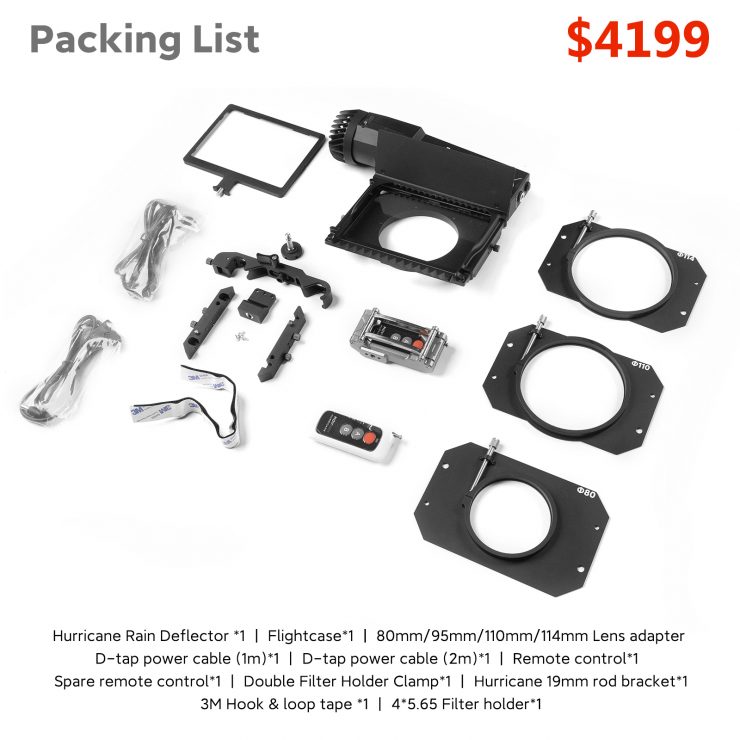 It appears to be powered via an included 1m and 2m power cables that have a D-tap on one end. The input voltage is 7.4v to 16.8v. You also get a single 4 x 5.65″ filter tray where you can add your own filter.