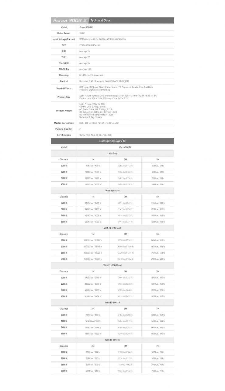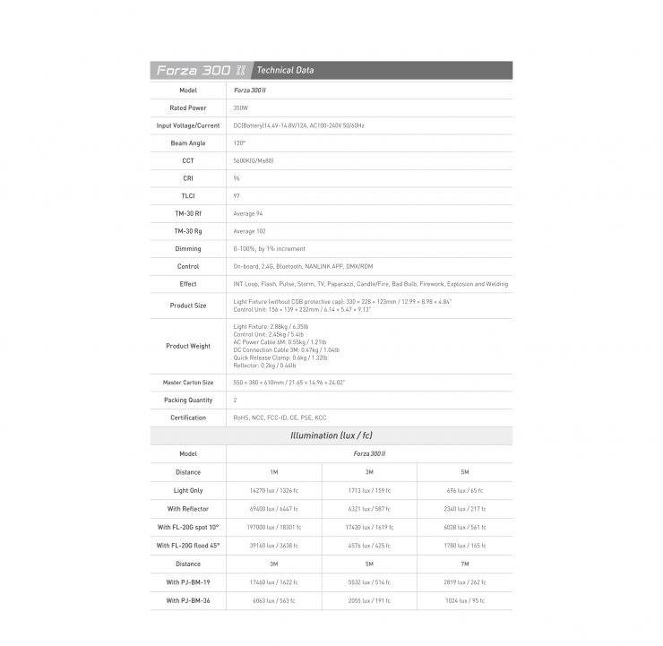 The Forza 300 II and 300B II can output 69,400lx and 43,480lx respectively when used with their included reflectors @1m. This is a lot of output from lights that draw 350W. As a comparison, we independently tested the Aputure LS 300d II @1m using its Hyper Reflector and got a reading of 45,600lx.