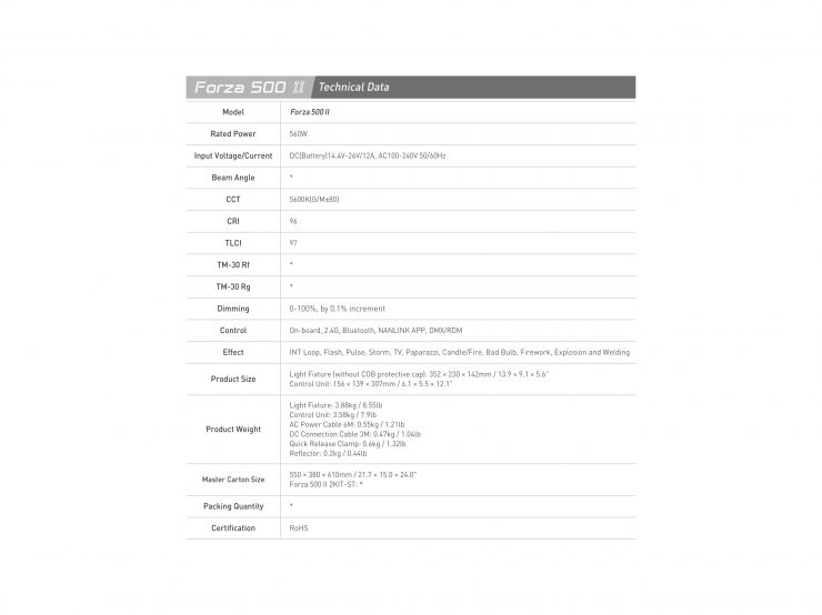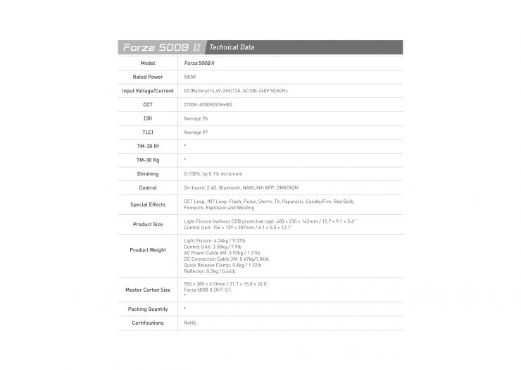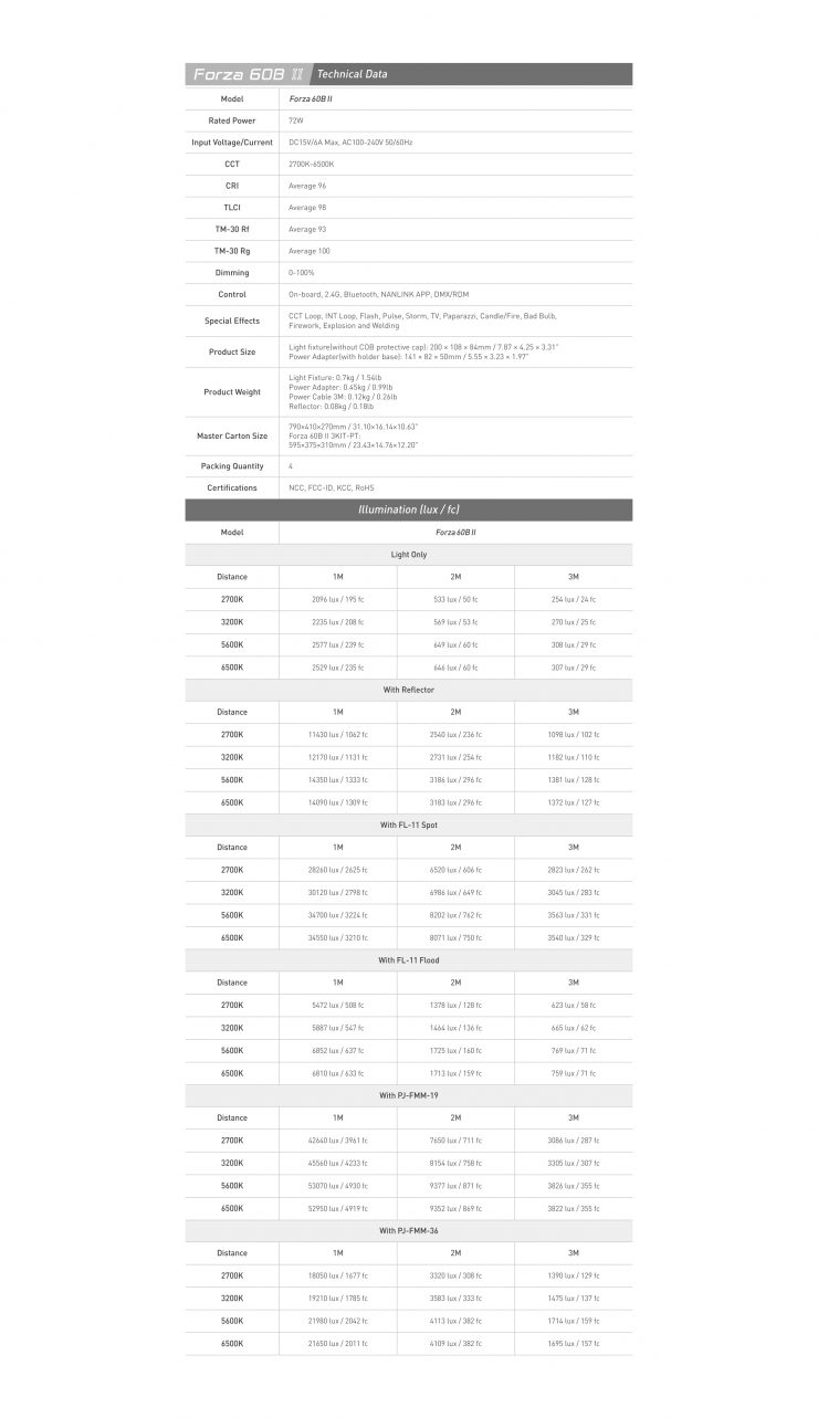 The Forza 60 II is claimed to be able to output 17,620lux @1m with its reflector being used. Conversely, the Forza 60B II is claimed to output 14,350lux @1m without is reflector being used. The lights also have a Maximum/Constant output mode and the Forza 60B II is CCT adjustable from 2700K to 6500K. Both fixtures have a CRI and TLCI rated at 96 and 98 respectively.