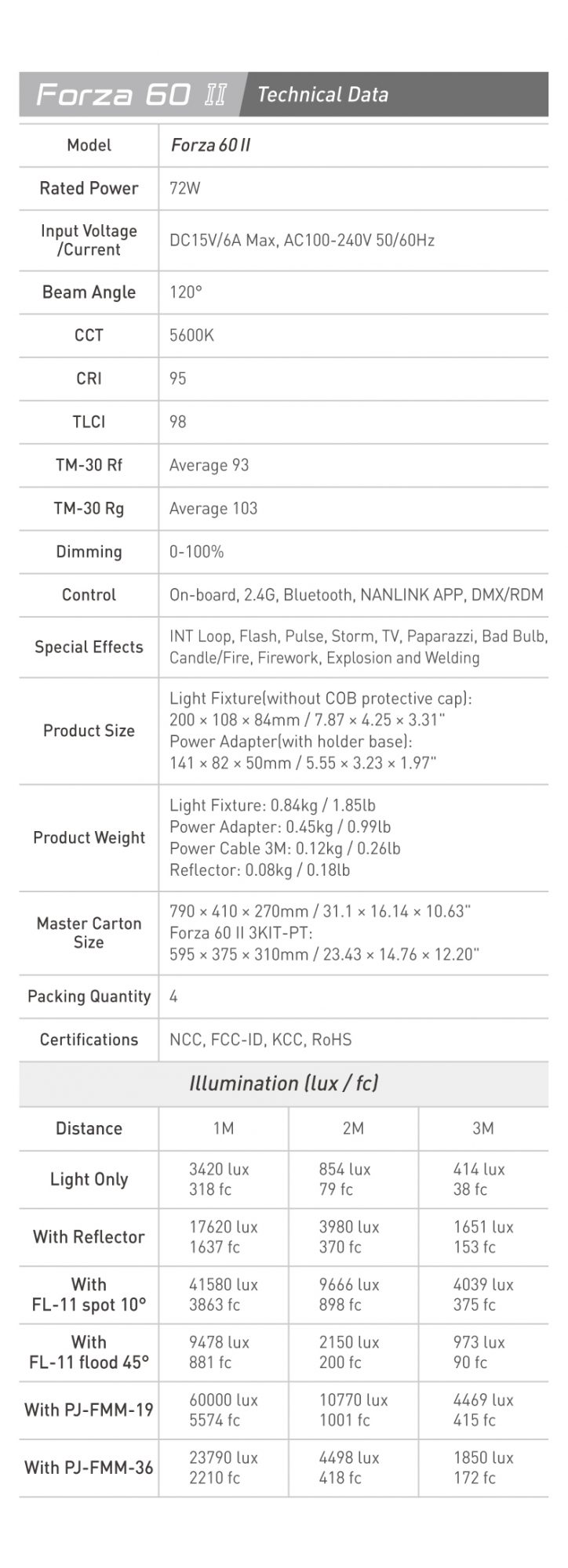 There are 11 special effects available in the Forza 60 II, and 12 in the Forza 60B II. All effects can have their individual parameters adjusted. Multiple control options include onboard, 2.4G, Bluetooth, and DMX/RDM.