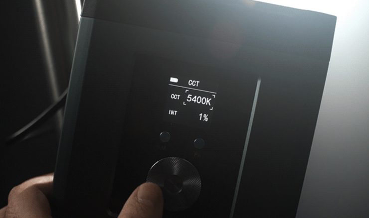 The A100B can be controlled via onboard controls or through an app. As far as power is concerned, the fixture can either be run from mains power or through a V-mount battery if you need to power it remotely on location. The light draws 100W.