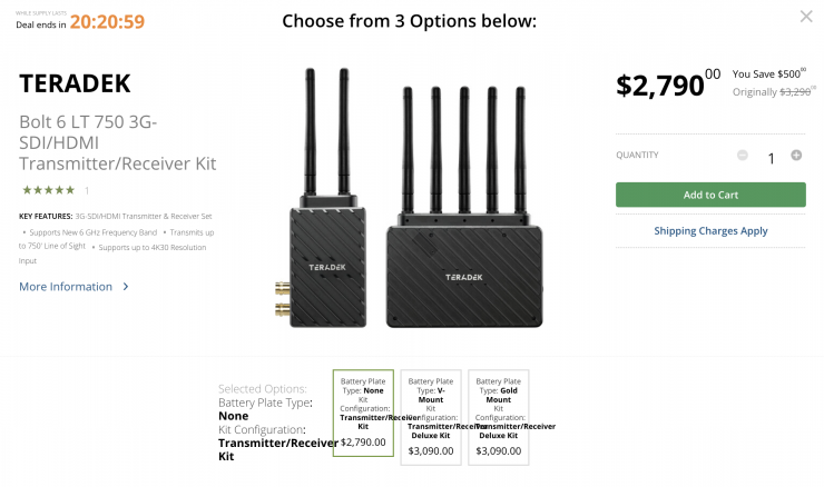 The Teradek Bolt 6 LT 750 3G-SDI/HDMI Transmitter/Receiver Kit is available in three different options with prices ranging from $2,790 USD to $3,090 USD. The Teradek Bolt 6 LT 750 3G-SDI/HDMI Wireless RX/TX Deluxe Kit is $1,130 USD off its regular listed price.