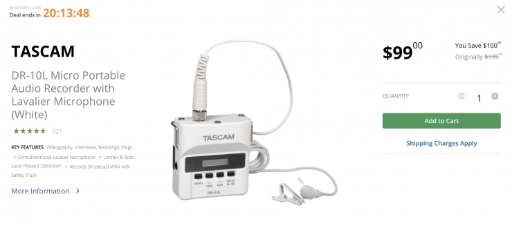 The ASCAM DR-10L Micro Portable Audio Recorder with Lavalier Microphone (White) is on sale for $99 USD which is a saving of $100 USD.