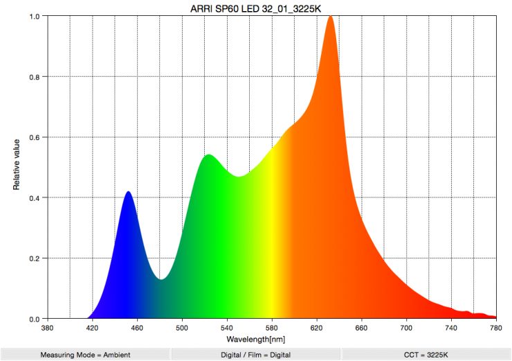 As a comparison, above is the spectral distribution of the ARRI S60-C SkyPanel when it is set at 3200K. Again, It is pretty clear to see that SUNNYXIAO is trying to mimic the spectral response of the SkyPanel.
