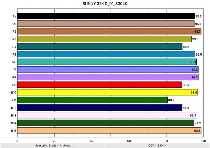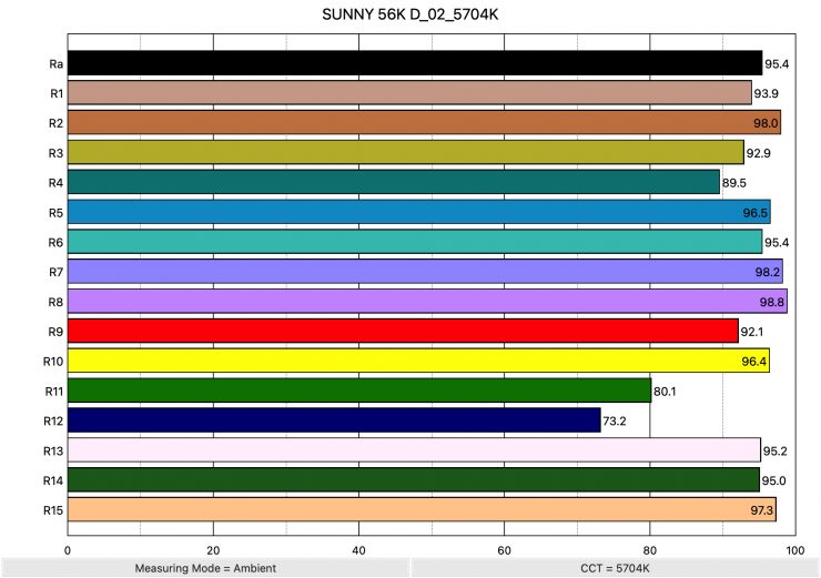 In the graph above the gold bars indicate a perfect CIE D55 source. The red bars indicate a perfect CIE D 5600K source. This lets us compare how close to a perfect 5600K lighting source the SUNNYXIAO is. A score in the low 70’s is typical for a 5600K LED source. The light, just like at 3200K didn’t have very good SSI scores. Low 60’s is not a good result and it is the worst I have seen since I started recording SSI scores.