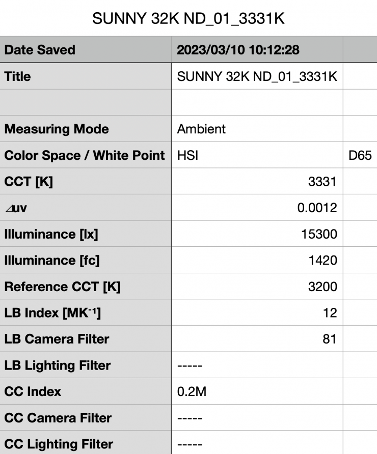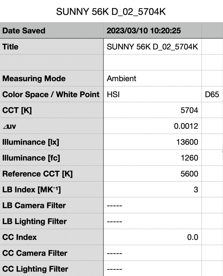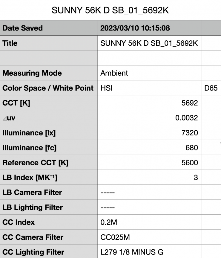 SSI (Spectral Similarity Index) was developed by the Sci-Tech Council of the Academy. SSI gives me the ability to set any light as a standard, or use predefined standards (such as CIE D55), and then give other lights an SSI score based upon how well they will match standards such as CIE D55. This way I can measure spectral response and compare it directly against an ideal light source. This is actually a much better test than recording CRI scores.