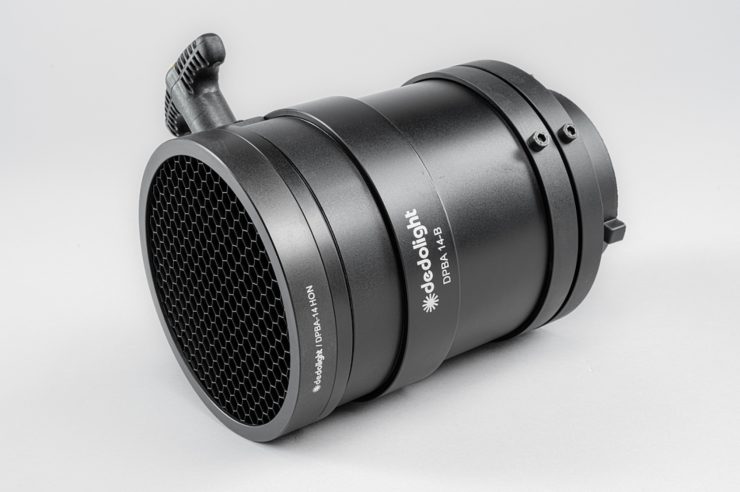 If the high intensity of the DZOOM-P isn’t required and a more portable and economical solution is preferred, the DPBA-14-P Parallel Beam Adapter is a compact and lightweight solution. It has a 17-degree beam on the Orion 300 FS with a claimed output of 40,500 lux (2m@5600K). On the Orion 675 FS it has a 14-degree beam with a claimed output of 60,500 lux (2m@5600K). Both the ZOOM-BP and the DPBA-14-B have removable honeycomb accessory fronts available to block light spill.
