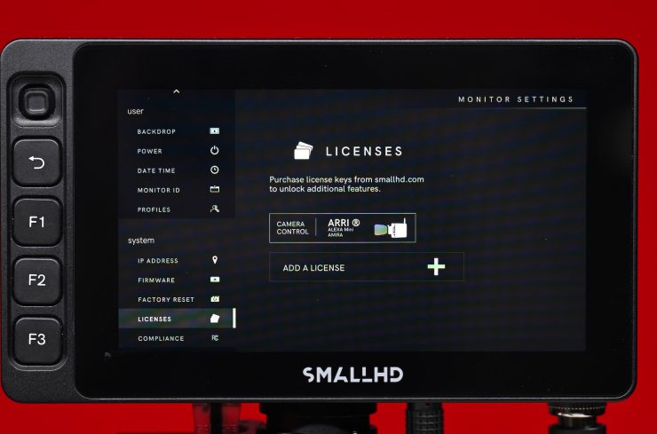 Once you have everything connected up and powered up, on your SmallHD monitor you then go to Settings and scroll down to System > Licenses. Tap the button to add a new license.