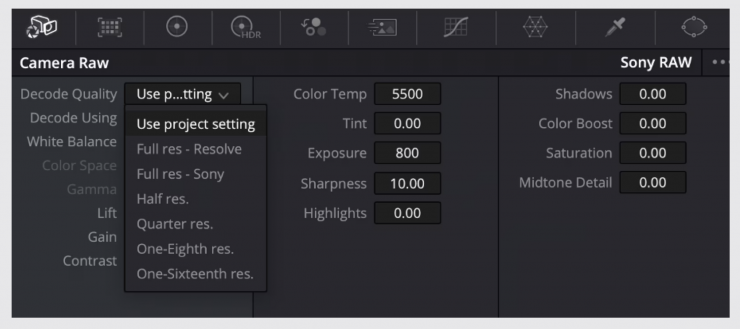 If you do require proxy files it is recommended that you allow Resolve to generate the proxy files. When working with X-OCN in DaVinci Resolve the following settings can be directly adjusted via the ‘Camera Raw’ settings: White Balance, Colourspace, Gamma, Lift, Gain, Contrast, Colour Temp, Tint, Gain, Exposure, Sharpness, Highlights, Shadows, Colour Boost, Saturation, Midtone Detail).