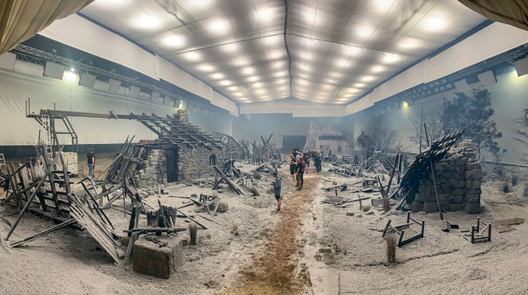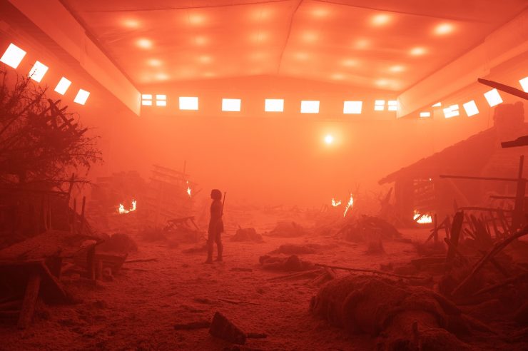 Disenhof rigged a sound stage with hundreds of ARRI SkyPanel S60 and S360 LED fixtures behind muslin screens around and above the village set, allowing him to fine tune the red color and create soft backlight in every direction. Fire and smoke on set was supplemented by VFX in post, adding more fires, airborne particles, and shadowy details in the background for greater compositional depth.