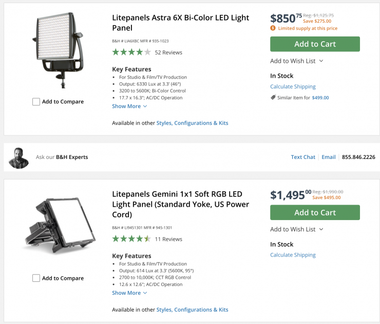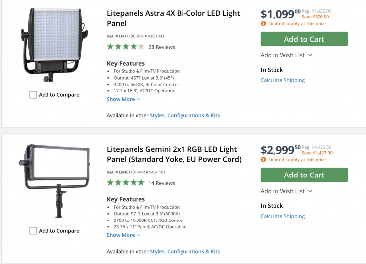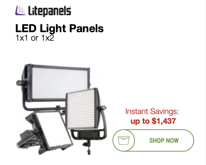 There are quite a few Litepanels 1×1 and 2×1 panel lights on sale with saving of up to $1,437 USD.