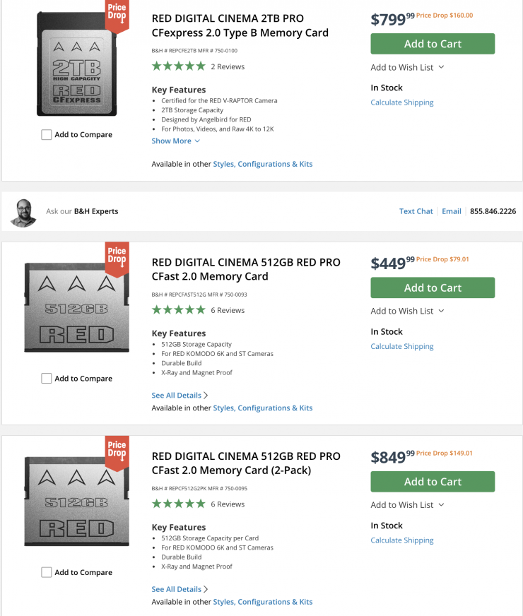 RED Digital Cinema CFast 2.0 and CFexpress Type B cards Memory Cards are on sale.