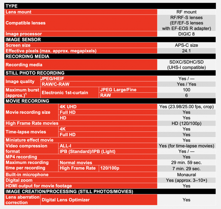 The EOS R100 features a 24.1 megapixel APS-C sensor and Dual Pixel CMOS AF, although the processor is an older DIGIC 8.