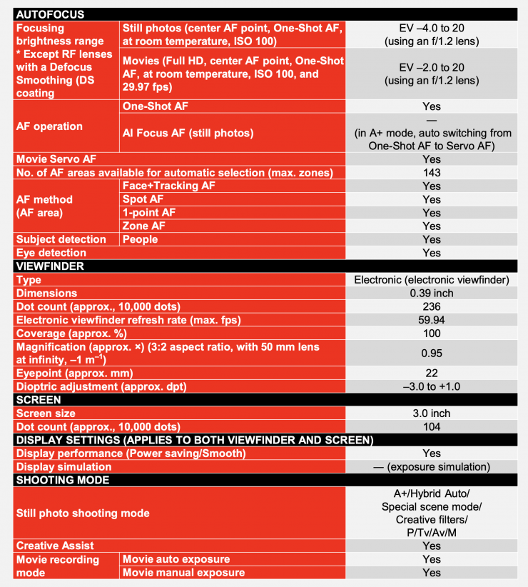 The EOS R100’s Dual Pixel CMOS AF is claimed to provide fast and accurate subject detection, tracking people’s eyes when using the viewfinder or the LCD. What you need to be aware of is that the AF zones are limited to just 143 zones. For reference, the EOS R50 has 651 zones. The EOS R100 also has the ability to capture up to 6.5 fps continuous shooting with One Shot AF and 3.5 fps with Continuous AF.