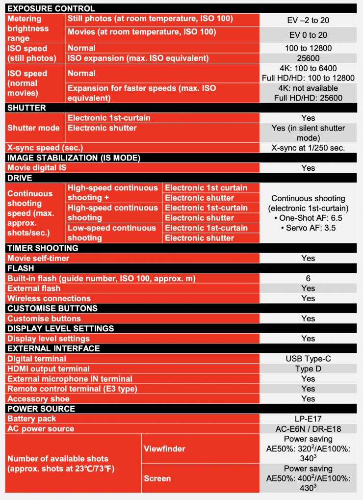The camera records to a single SD card slot and it utilizes Canon LP-E17 batteries. There is a USB-C port and an HDMI out, as well as a 3.5mm microphone input. There is no physical headphone jack.