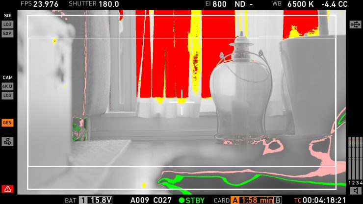 When a gray card is used (or another object in the scene with a similar reflectance level), the exposure can be set such that the card is in the green zone. At the same time, the purple and red zones will indicate when the limits of the sensor are exceeded. There is a subtle difference between the purple and red zones. I use false colors all the time to determine optimum exposure. Not only are false colors a good way of seeing what is being clipped and where middle grey should fall, but they are also very helpful in seeing how much contrast you have in your scene.