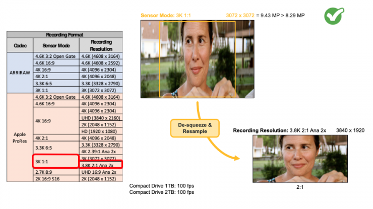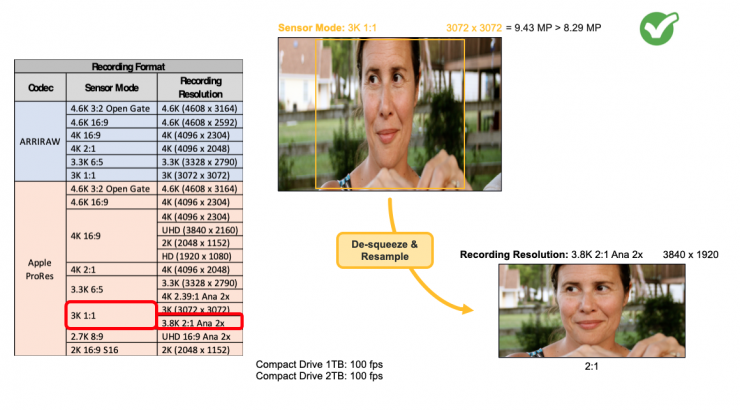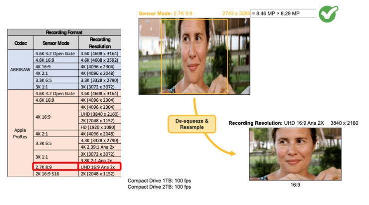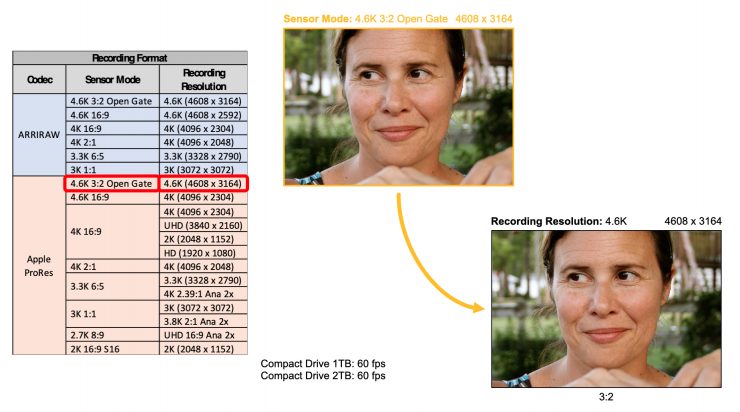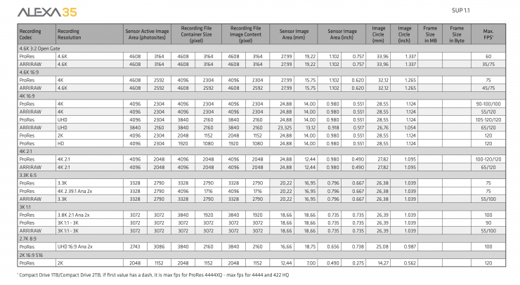 | Sensor Active Image Area (photosites) | ARRIRAW 4.6K 3:2 Open Gate : 4608 x 3164 4.6K 16:9: 4608 x 2592 4K 16:9: 4096 x 2304 4K 2:1: 4096 x 2048 3.3K 6:5: 3328 x 2790 3K 1:1: 3072 x 3072 ProRes 4.6K 3:2 Open Gate : 4608 x 3164 4.6K 16:9: 4608 x 2592 4K 16:9 Sensor Mode- 4K: 4096 x 2304 4K 16:9 Sensor Mode- UHD: 4096 x 2304 4K 16:9 Sensor Mode- 2K: 4096 x 2304 4K 16:9 Sensor Mode- HD: 4096 x 2304 4K 2:1 Sensor Mode- 4K: 4096 x 2048 3.3K 6:5 Sensor Mode- 3.3K: 3328 x 2790 3.3K 6:5 Sensor Mode- 4K 2.39:1 2x Ana: 3328 x 2790 3K 1:1 Sensor Mode- 3K: 3072 x 3072 3K 1:1 Sensor Mode- 3.8K 2:1 Ana: 3072 x 3072 2.7K 8:9 Sensor Mode- UHD 16:9 Ana 2x: 2743 x 3086 2K 16:9 S16 Sensor Mode- 2K: 2048 x 1152 |