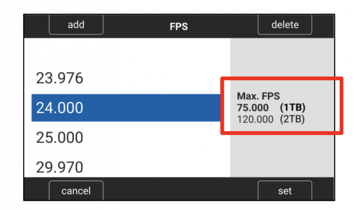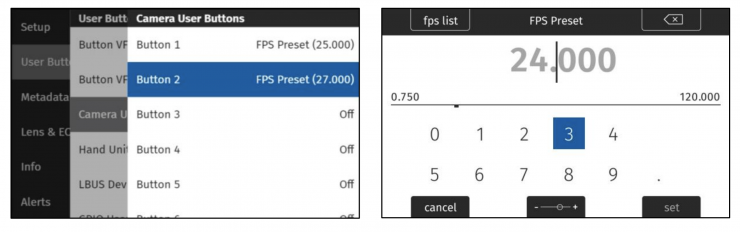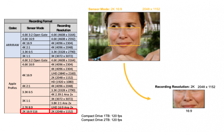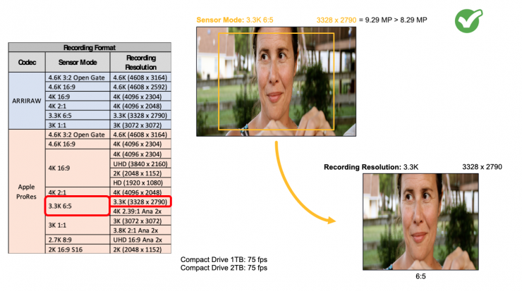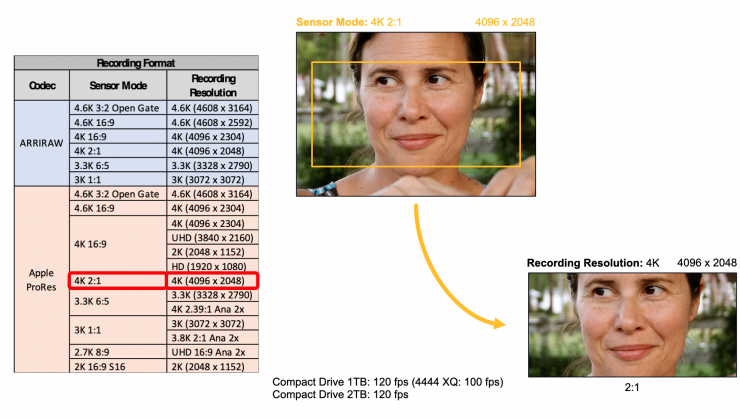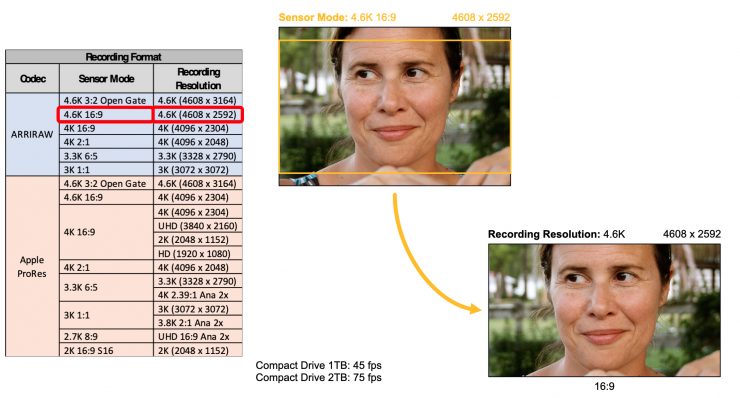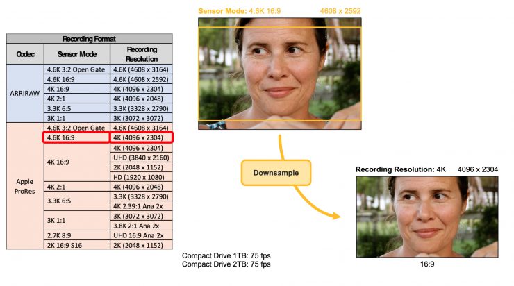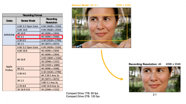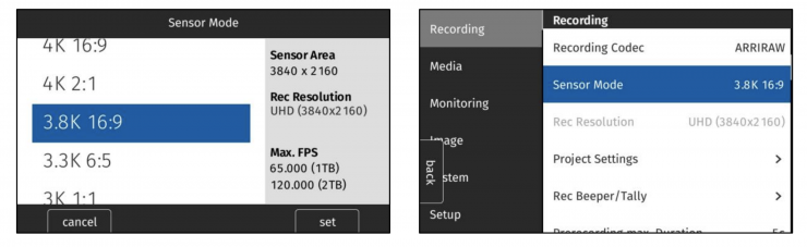 | Recording Frame Rates | ARRIRAW 4.6K Open Gate: 0.75 – 75 fps 4.6K 16:9: 0.75 – 75fps 4K 2:1: 0.75 – 120fps 3.3K 6:5: 0.75- 120fps 3K 2:1: 0.75 – 100fps ProRes 4.6K Open Gate: 0.75 – 60 fps 4K: 0.75- 75fps 4K 2.39:1 2x Ana: 0.75 – 90fps UHD 16:9: 0.75 – 120fps UHD 16:9 2x Ana: 0.75 – 100fps 3.8K 2:1 2x Ana: 0.75 – 100fps 3.3K: 0.75 – 3K: 0.75 – 90fps 2K: 0.75 – 120fps HD: 0.75 – 120 fps |