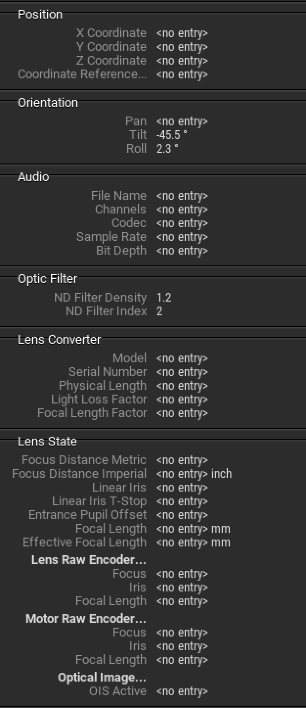 | Filters | Built-in motorized ND filters 0.6, 1.2, 1.8 Fixed optical low pass, UV, IR filter |