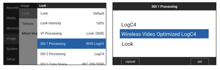 - New look handling: View SDR and HDR of the same look on set, set Look Intensity, use in-camera LogC4 Look Library