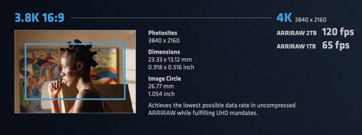 | Sensor Active Image Area (dimensions) | ARRIRAW 4.6K 3:2 Open Gate : 27.99 mm x 19.22 mm (Ø 33.96 mm) 4.6K 16:9: 27.99 mm x 15.75 mm (Ø 32.12 mm) 4K 16:9: 24.88 mm x 14.00 mm (Ø 28.55 mm) 4K 2:1: 24.88 mm x 12.44 mm (Ø 27.82 mm) 3.3K 6:5: 20.22 mm x 16.95 mm (Ø 26.38 mm) 3K 1:1: 18.66 mm x 18.66 mm (Ø 26.39 mm) ProRes 4.6K 3:2 Open Gate: 27.99 mm x 19.22 mm (Ø 33.96 mm) 4.6K 16:9: 27.99 mm x 15.75 mm (Ø 32.12 mm) 4K 16:9 Sensor Mode- 4K: 24.88 mm x 14.00 mm (Ø 28.55 mm) 4K 16:9 Sensor Mode- UHD: 24.88 mm x 14.00 mm (Ø 28.55 mm) 4K 16:9 Sensor Mode- 2K: 24.88 mm x 14.00 mm (Ø 28.55 mm) 4K 16:9 Sensor Mode- HD: 24.88 mm x 14.00 mm (Ø 28.55 mm) 4K 2:1 Sensor Mode- 4K: 24.88 mm x 12.44 mm (Ø 27.82 mm) 3.3K 6:5 Sensor Mode- 3.3K: 20.22 mm x 16.95 mm (Ø 26.38 mm) 3.3K 6:5 Sensor Mode- 4K 2.39:1 2x Ana: 20.22 mm x 16.95 mm (Ø 26.38 mm) 3K 1:1 Sensor Mode- 3K: 18.66 mm x 18.66 mm (Ø 26.39 mm) 3K 1:1 Sensor Mode- 3.8K 2:1 Ana: 18.66 mm x 18.66 mm (Ø 26.39 mm) 2.7K 8:9 Sensor Mode- UHD 16:9 Ana 2x: 16.66 mm x 18.75 mm (Ø 25.08 mm) 2K 16:9 S16 Sensor Mode- 2K: 12.44 mm x 7.00 mm (Ø 14.27 mm) |