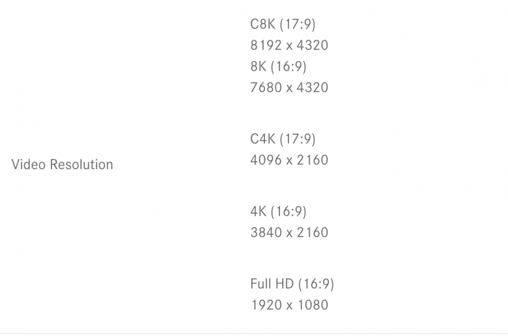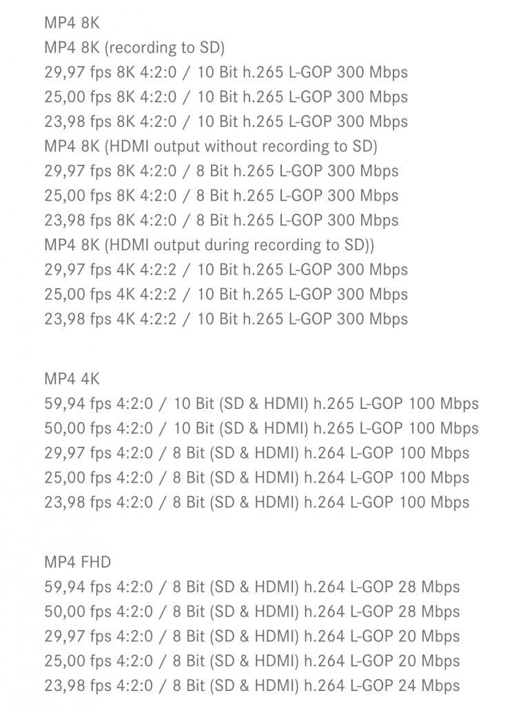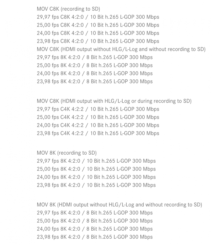 DCI 8K recording is supported at up to 30p with 4:2:0 10-bit color when recording internally or at 8-bit when recording externally via the micro-HDMI port.