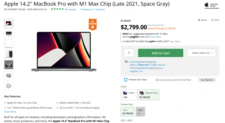 The Apple 14.2″ MacBook Pro with M1 Max Chip (Late 2021, Space Gray) is on sale for $2,799 USD which is a saving of $1,300 USD.