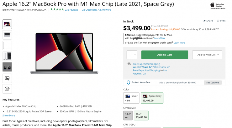 The Apple 16.2″ MacBook Pro with M1 Max Chip (Late 2021, Space Gray) is on sale for $3,499 USD which is a saving of $1,400 USD.