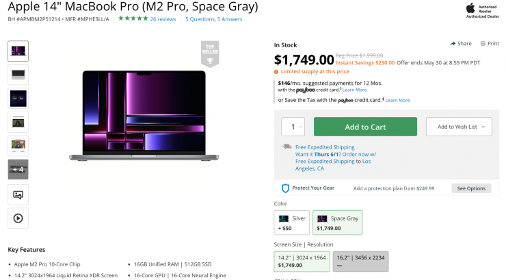 The Apple 14″ MacBook Pro (M2 Pro, Space Gray) is on sale for $1,749 USD which is a saving of $250 USD.