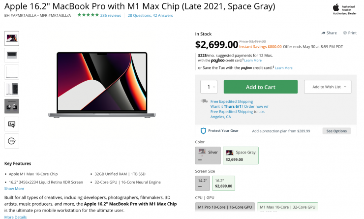 The Apple 16.2″ MacBook Pro with M1 Max Chip (Late 2021, Space Gray) is on sale for $2,699 USD which is a saving of $800 USD.