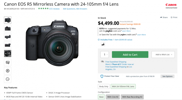 The Canon EOS R5 Mirrorless Camera with 24-105mm f/4 Lens is on sale for $4,499 USD which is a saving of $500 USD.