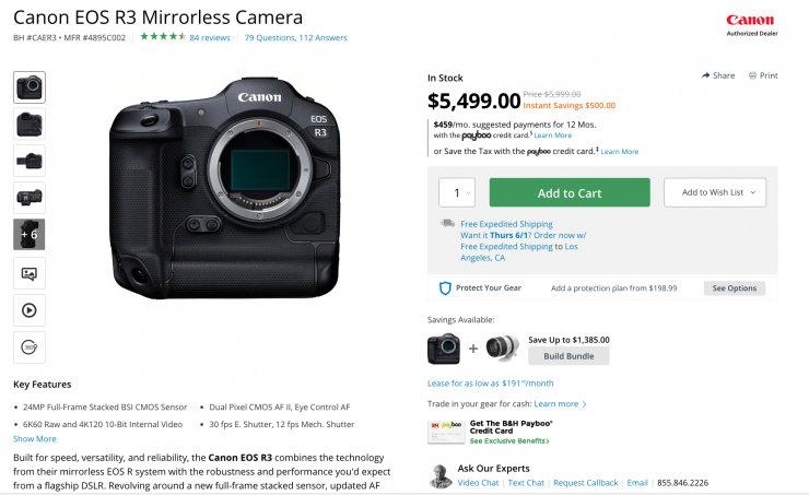 The Canon EOS R3 Mirrorless Camera is on sale for $5,499 USD which is a saving of $500 USD.