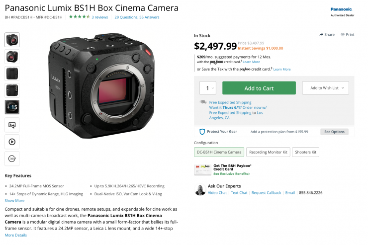 The Panasonic Lumix BS1H Box Cinema Camera is on sale for $2,497.99 USD which is a saving of $1,000 USD.