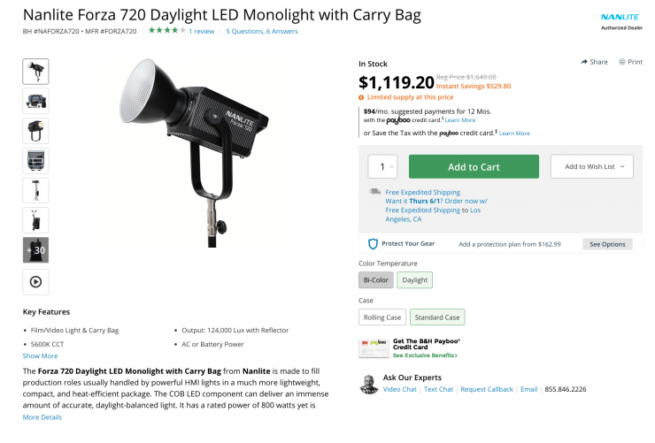 The Nanlite Forza 720 Daylight LED Monolight with Carry Bag is on sale for $1,119.20 USD which is a saving of $529.80 USD.