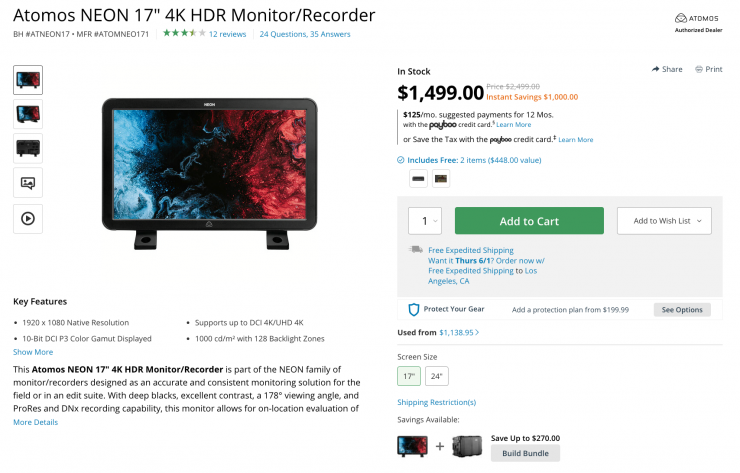 The Atomos NEON 17″ 4K HDR Monitor/Recorder is on sale for $1,499 USD which is a saving of $1,000 USD.