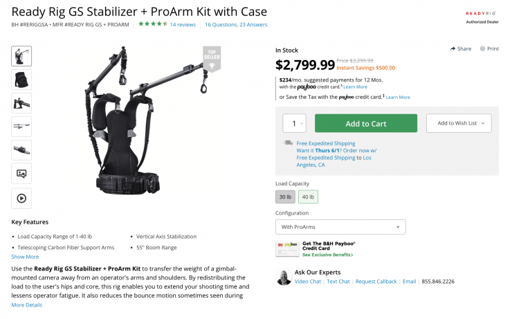 The Ready Rig GS Stabilizer + ProArm Kit with Case is on sale for $2,799.99 USD which is a saving of $500 USD.