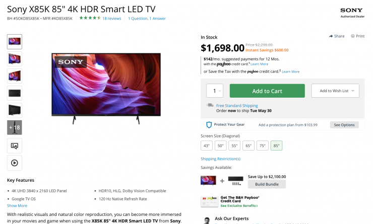 The Sony X85K 85″ 4K HDR Smart LED TV is on sale for $1,698 USD which is. a saving of $600 USD.