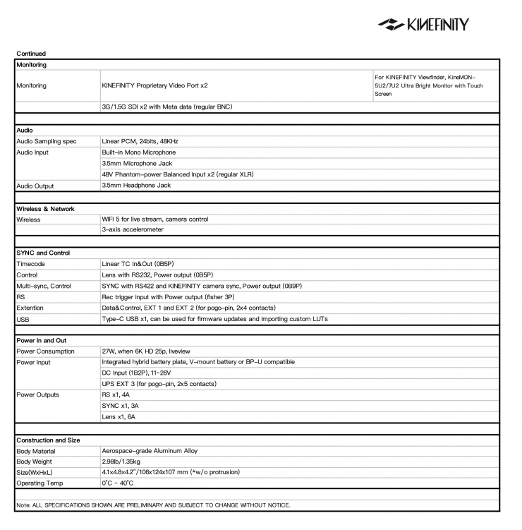 Kinefinity dropped ProRes RAW and KineRaw options from their cameras because of legal issues with RED. Both of the new cameras are capable of recording in flavors of ProRes ranging from ProRes 422 LT up to ProRes4444XQ.