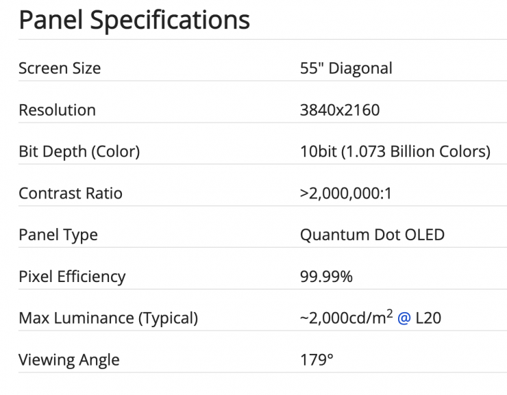 Other available OLED technologies are either too dim for HDR mastering or suffer from very significant volumetric collapse due to their non-additive RGB+W sub pixel structures making them unsuitable for HDR use cases that demand color accuracy. QD-OLED is truly RGB additive for white, thus avoiding color volume limitations, and easily exceeds 1,000nits peak luminance with plenty of headroom to spare.