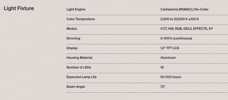 The light features Kelvin’s sophisticated 6-channel RGBACL light engine Cantastoria, which produces a full spectrum of colors within the 2,000 – 20,000K range. The Cantastoria Engine utilizes Red, Green, Blue, Amber, Cyan and Lime. As I mentioned earlier, this is the same light engine that is found in Kelvin’s flagship products.