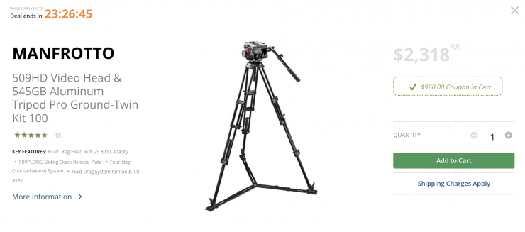 The Manfrotto 509HD Video Head & 545GB Aluminum Tripod Pro Ground-Twin Kit 100 is on sale for $1,398.88 USD which is a saving of $920 USD.