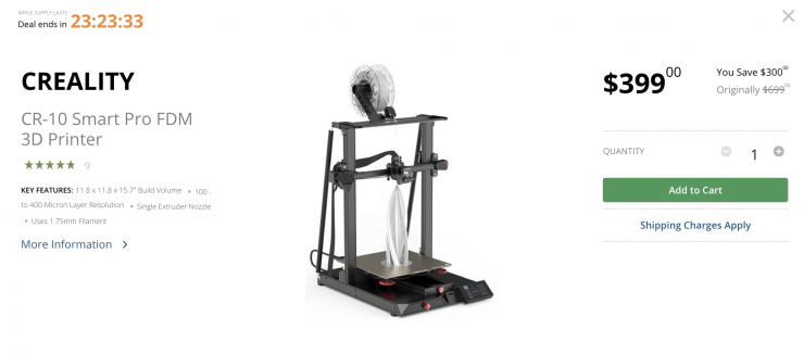The Creality CR-10 Smart Pro FDM 3D Printer is on sale for $399 USD which is a saving of $300 USD.