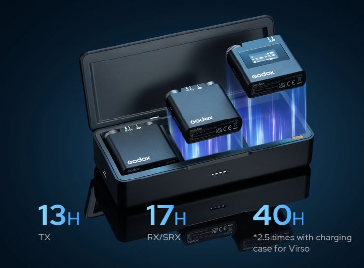 According to Godox, the system offers extended battery life, with up to 13H of operation for the transmitter and 17H for the receiver on a single charge. The standard version Virso M2 package also includes a charging case.