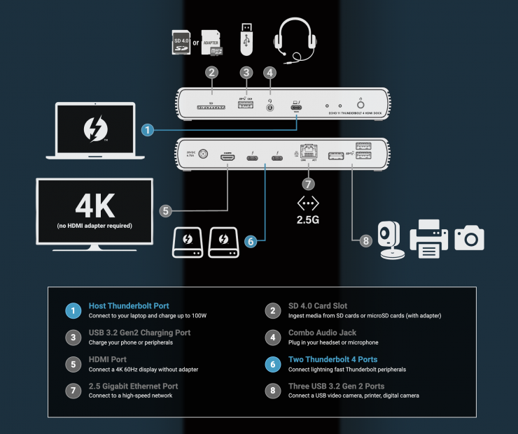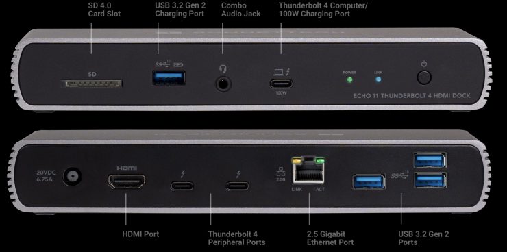 The Sonnet Echo 11 Thunderbolt 4 HDMI Dock is a universal Thunderbolt 4 dock with three Thunderbolt 4 ports, one HDMI port, 2.5Gb ethernet, and 8K display support