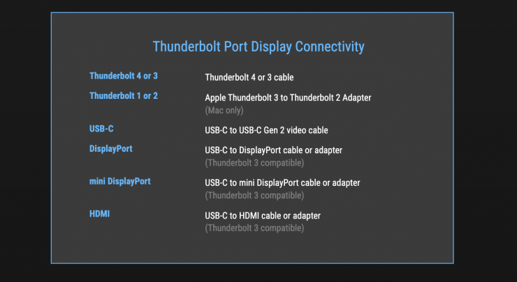 Depending on your computer’s video capability and whether you’ve connected a monitor to the built-in HDMI port, the Echo dock’s Thunderbolt ports can support one (always 4K, 5K or 6K, up to 8K) monitor, or up to two 6K monitors; see Tech Specs. You can plug in Thunderbolt 3 or USB-C monitors directly, or, you may connect other display types (HDMI, DisplayPort, etc.) by using a Thunderbolt-compatible adapter (sold separately).