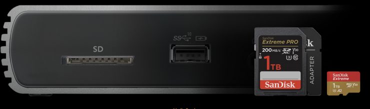 The included SD card slot is compatible with SD, SDHC, and SDXC memory cards, and supports 320 MB/s read speeds with UHS-II SDXC cards to quickly offload images and video. microSD cards are also supported when used with adapters commonly included with the cards.