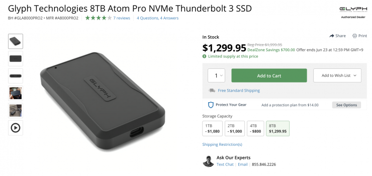 The Glyph Technologies 8TB Atom Pro NVMe Thunderbolt 3 SSD is on sale for $1,299.95 USD, which is a saving of $700 USD.