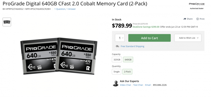 The ProGrade Digital 640GB CFast 2.0 Cobalt Memory Card (2-Pack) is on sale for $789.99 USD which is a saving of $290 USD.